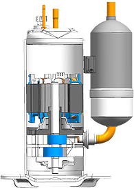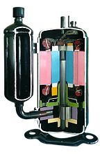 It is called a rotary compressor, and is mainly used for air conditioners by compressing high-temperature and high-pressure gas while the roller rotates inside the cylinder.